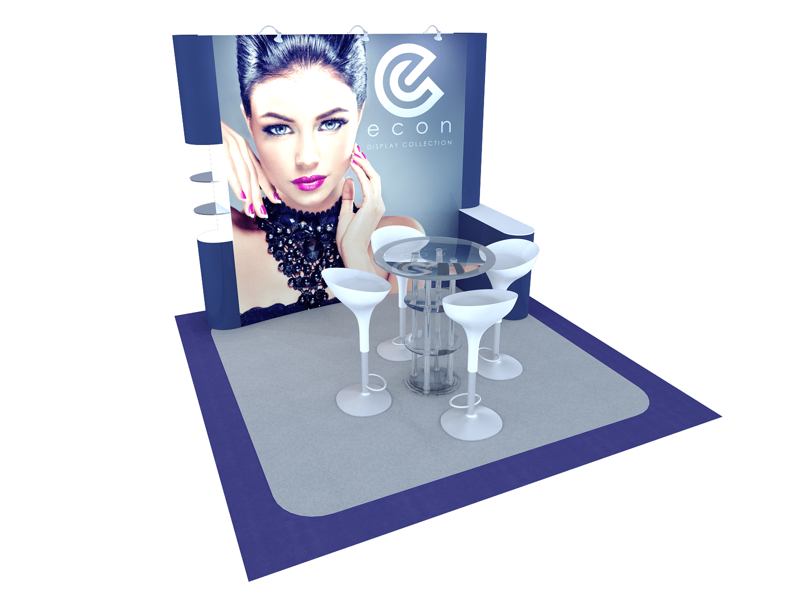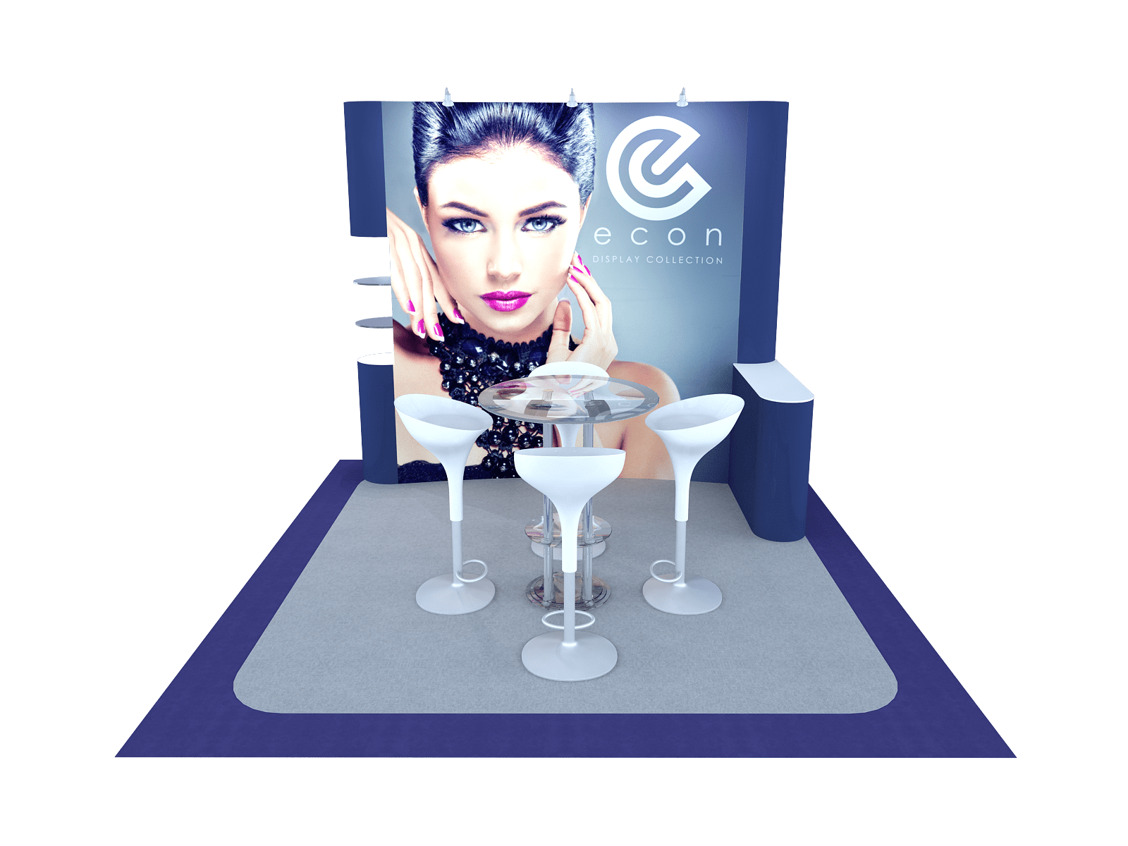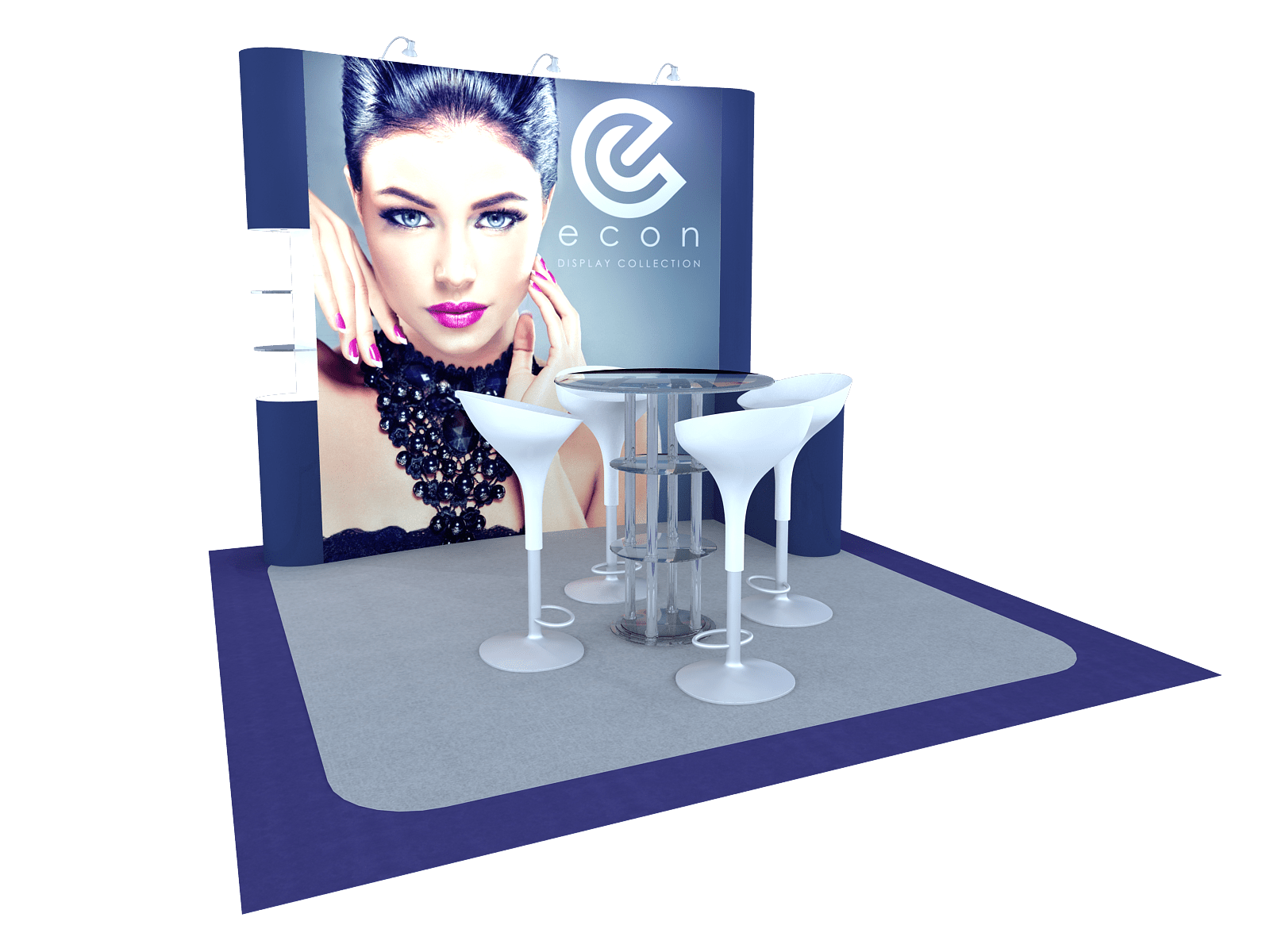 Invest in a reusable, high quality 10×10′ popup event display & trade show booth package for maximum impact at corporate events and expos. This ECON exhibit booth system is economical with tool-free framing push button framing. Our commercial grade trade show booths are an affordable yet high end alternative to traditional run of the mill pop-up event displays saturating the market today. Each package includes bold, high resolution graphics and easy pop up aluminum framing for easy setup, installation, and disassembly. You’ll have peace of mind knowing your display system is completely expandable and re-configurable from one trade show space to the next. Every ECON booth design can be customized and accessorized to fit your trade show exhibit and event needs.